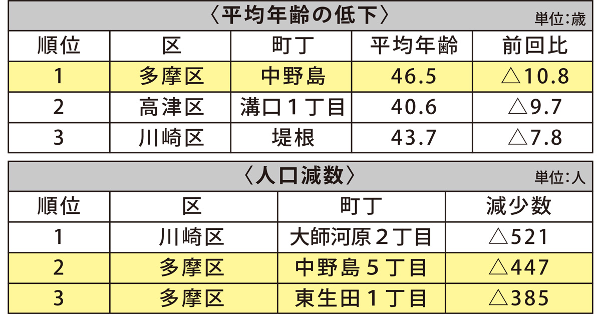 川崎市全体の平均年齢は42・8歳で前回調査から1・3歳上昇。多摩区は42・4歳で、前回より1・7歳高くなった。町丁別では、上昇上位20町丁に生田1丁目(4・7歳上昇)、寺尾台2丁目(4・5歳上昇)が入っている。