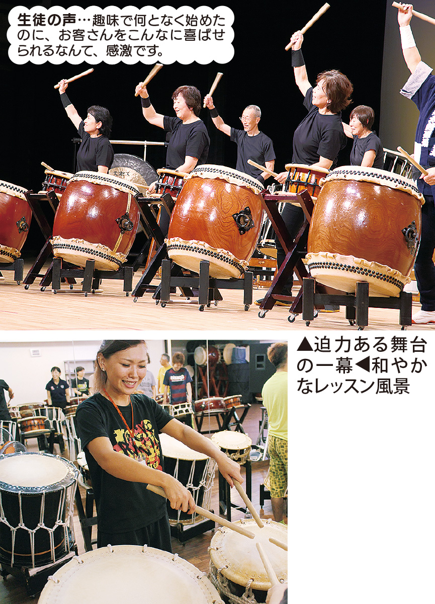 音楽界でもひときわ存在感を放つ、和太鼓プロ集団「梵天」が主宰。生徒は女性が半数以上を占め、子どもから年配者までレッスン中も和気あいあいとした雰囲気だ。「頭と体を使ってリフレッシュできる」「みんなで声を出して汗をかくと、元気になれる」と充実した様子がうかがえる。
