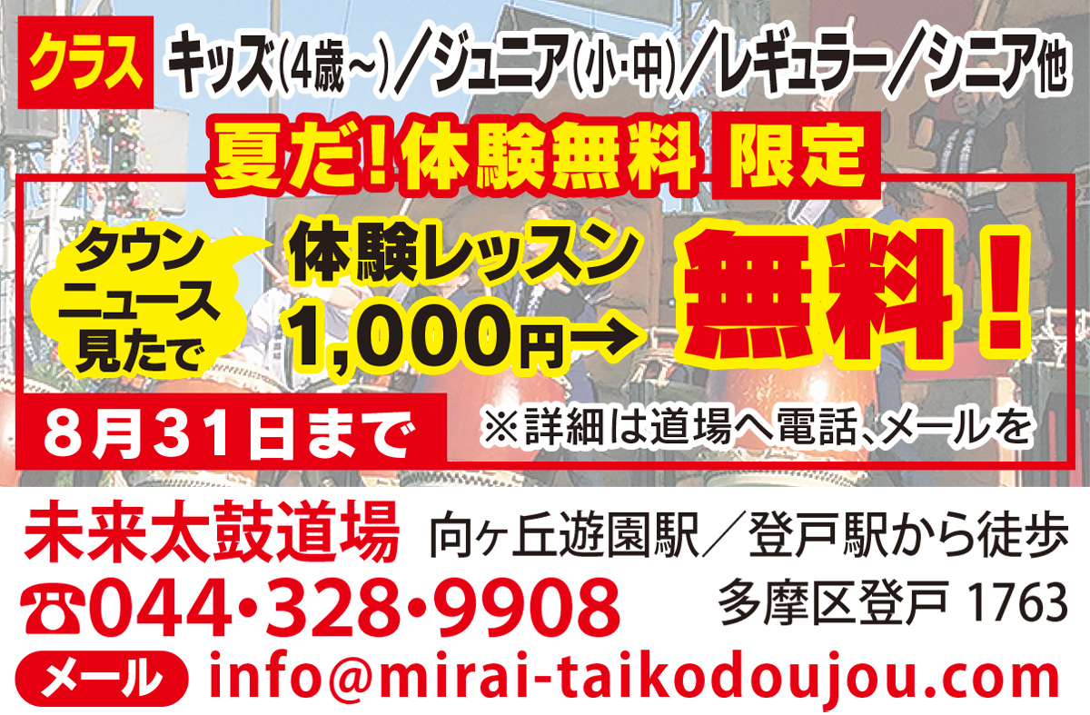 全身でリズムを感じ、心とカラダが喜ぶ――。初心者からベテランまで、趣味感覚で和太鼓にハマり、感動や喜びを仲間と分かち合う「未来太鼓道場」。多摩区登戸で20年以上の実績を持ち、350人以上が通う道場では、体験レッスンの申し込みが続々と増えている。