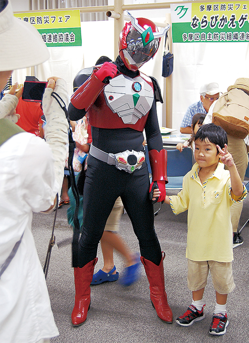 区総合庁舎で8月3日に行われた「多摩区防災フェア」では、初めて一般にお披露目。生田町連の吉田会長と一緒に、啓発物やオリジナルグッズの缶バッジを配布しながら、子どもたちと触れ合った。吉田会長は「子どもたちに人気で、結構好評。一緒にいるだけでPRになる。さまざまな催しで活躍してもらいたい」と話していた。