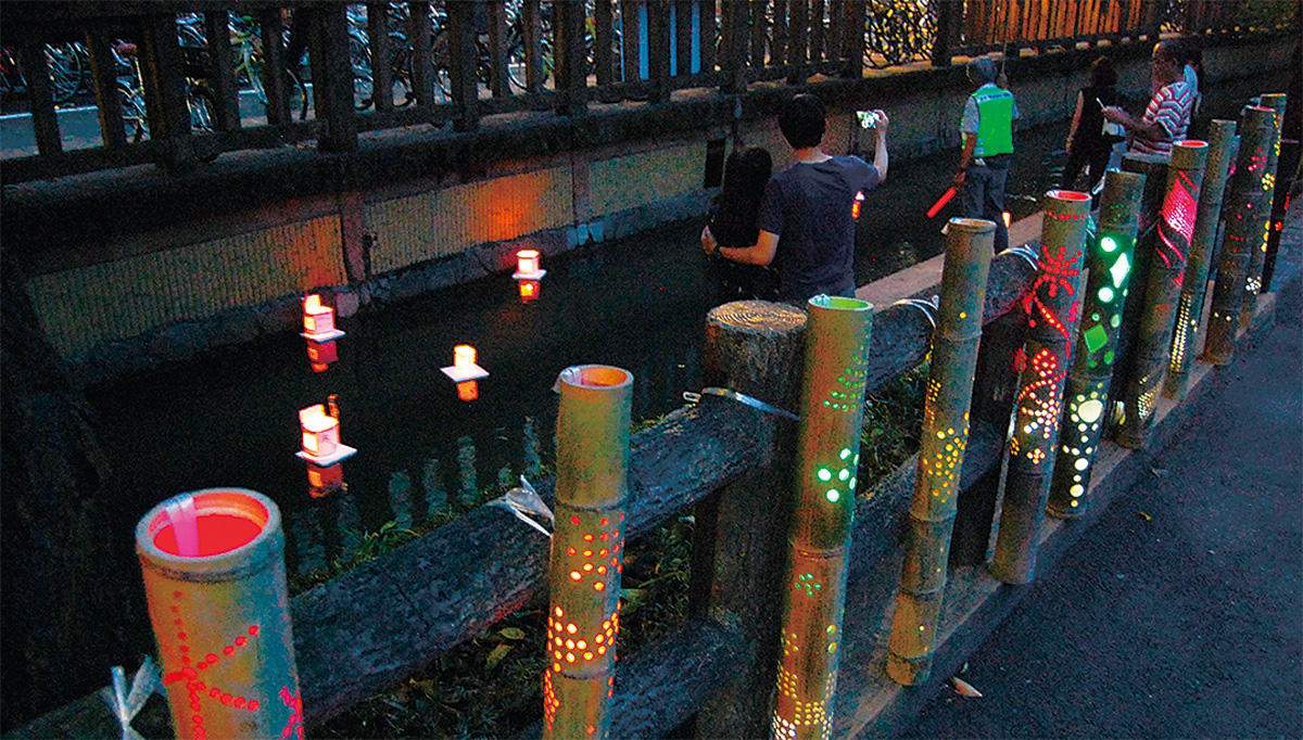宿河原町会と子ども会主催の「二ヶ領用水灯籠流し」が今月16日、3年ぶりに開催された。宿河原駅前商店会と市立稲田中学校美術部による「竹明かり」のオブジェが川沿いに初めて設置され、催しを彩った。