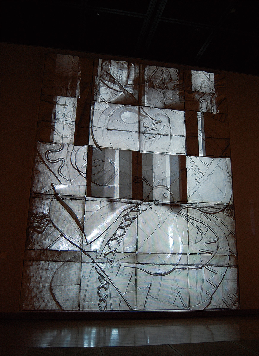 今回プロジェクションマッピングが施されたのは、代表作の一つである「日の壁」。旧東京都庁に掲げられた鮮やかな彩色の壁画だったが、旧庁舎とともに1991年に取り壊されてしまった。同展では、現物から型取りされた原寸大の無彩色のレプリカを展示。多摩美術大学情報デザイン学科特任教授で、東京駅などのプロジェクションマッピングを手掛けた寺井弘典さんの指導の下、同学科の齊藤公太郎さんが映像制作を担当した。