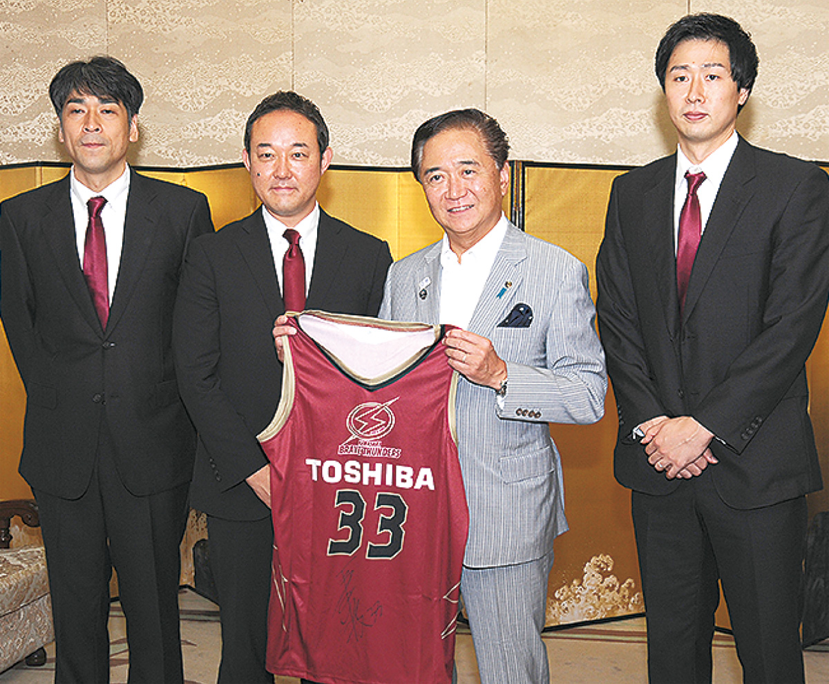 同クラブ運営会社の元沢伸夫社長、北卓也ヘッドコーチと長谷川技(たくみ)選手は翌日30日、クラブとして初めて黒岩祐治県知事を表敬訪問=写真。黒岩知事は「プロバスケの力を県民の皆さんのスポーツ振興につなげられれば」と期待感を示した。