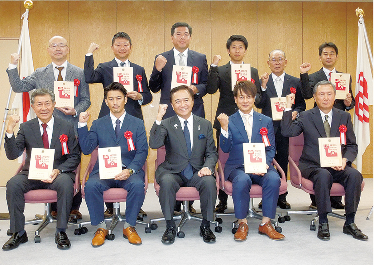 県は2018年度「神奈川がんばる企業エース」の認定式を10月4日に県庁舎で実施。「エース」に選ばれた、多摩区のQLデンタルメーカー(株)を含む県内10企業の代表者らが出席した=写真。