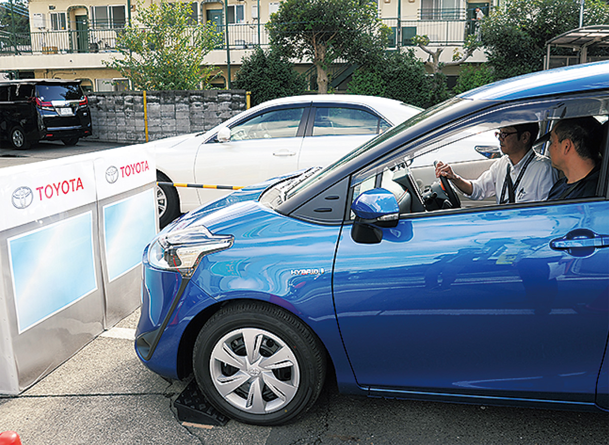 車体のセンサーで前後の障害物を感知し、一定の距離まで近づくと自動ブレーキで衝突を防ぐという仕組み。体験会ではスタッフの運転のもと、ブレーキの作動がリアルに体感できる。「高齢者の事故が話題になっているが、万が一に備えてサポート機能があると安心」と参加者。■横浜トヨペット登戸店/宿河原2の48の2の101/【電話】044・922・8111