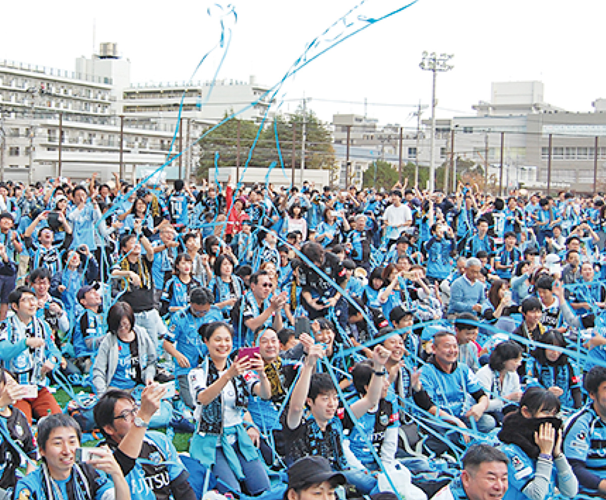 市内では、フロンターレを応援しようと、洗足学園音楽大学(高津区)でパブリックビューイング(PV)が行われた。約1100人のサポーターが集まり、声援を送った=写真下。