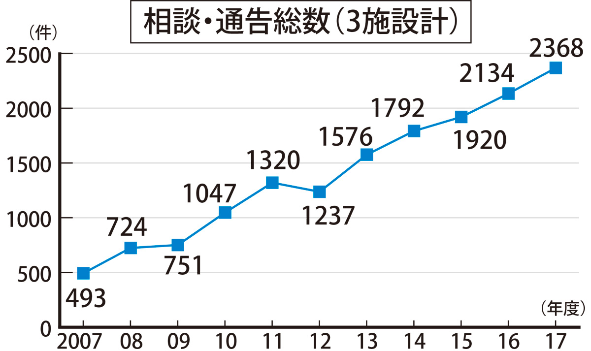 児相が受ける相談や通告は年々増加しており、17年度は2368件で過去最多に。事後調査で虐待が確認できなかった事例を含み、10年前の493件から1875件増えている。5年前からは区役所への通告件数も集計しており、17年度は895件だった。