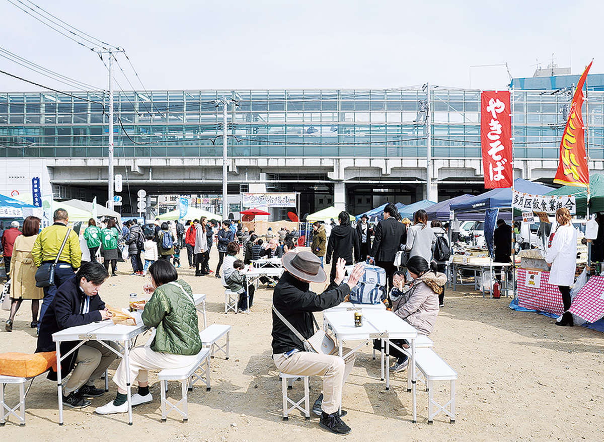 区画整理事業が進む登戸駅西側エリアの更地で3月30日、野外イベント「登戸宿場市」が開催された。主催は登戸駅前商店会(吉澤和久会長)。登戸そだて隊、地権者らが集まる「登戸を良くする地主の会」共催。