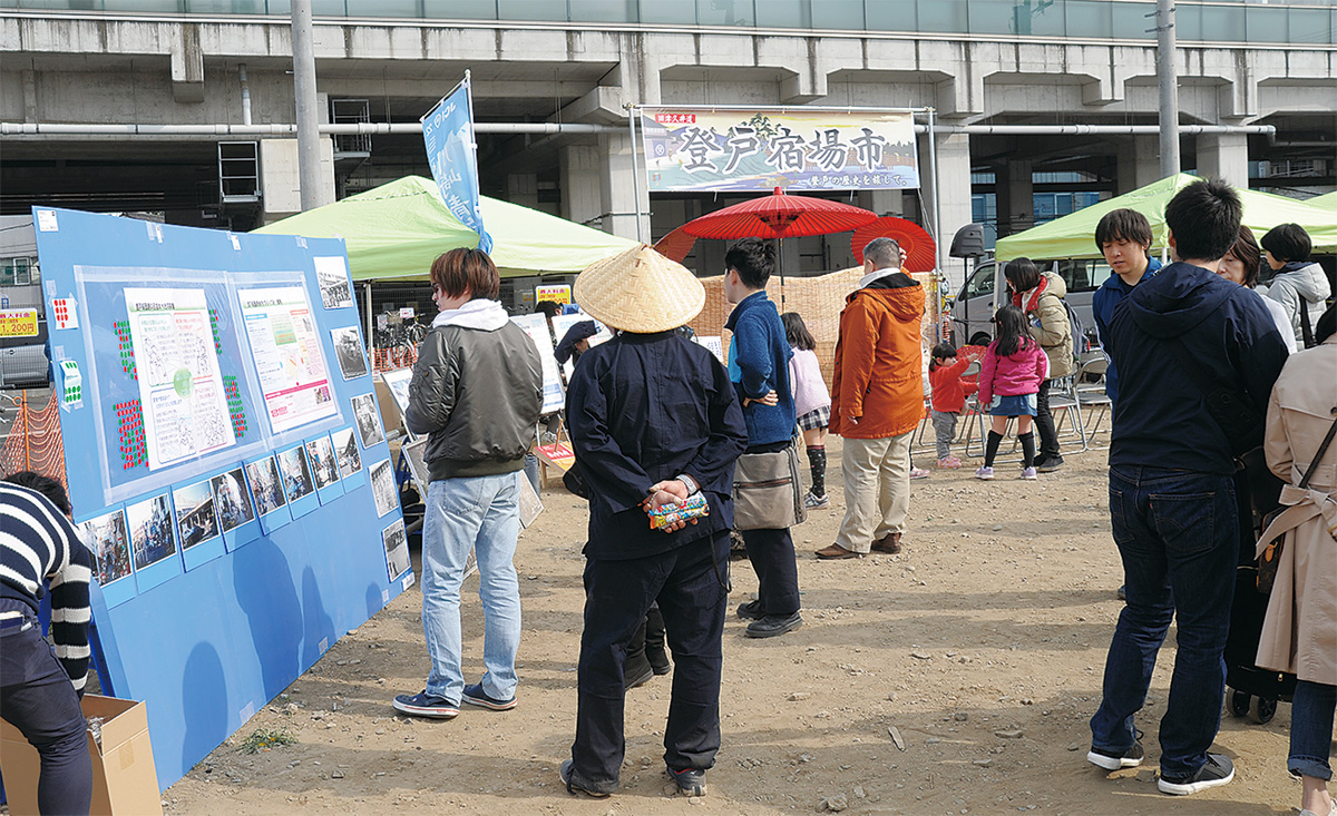 出店した稲田郷土史会の会長、鶴見邦男さん(71)は「かつてにぎわっていた登戸の歴史を後世に伝えていければ」と強調。近所から来た70代の女性は「買い物ができる大きなショッピングセンターが駅前にできたらうれしい。今後の区画整理が楽しみ」と話した。