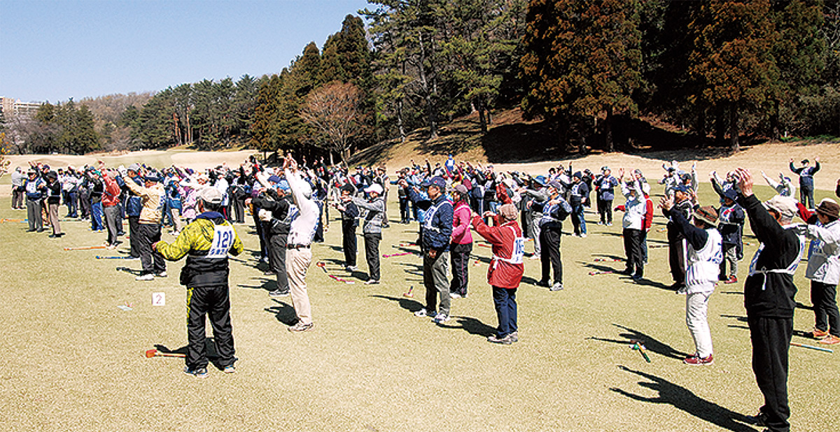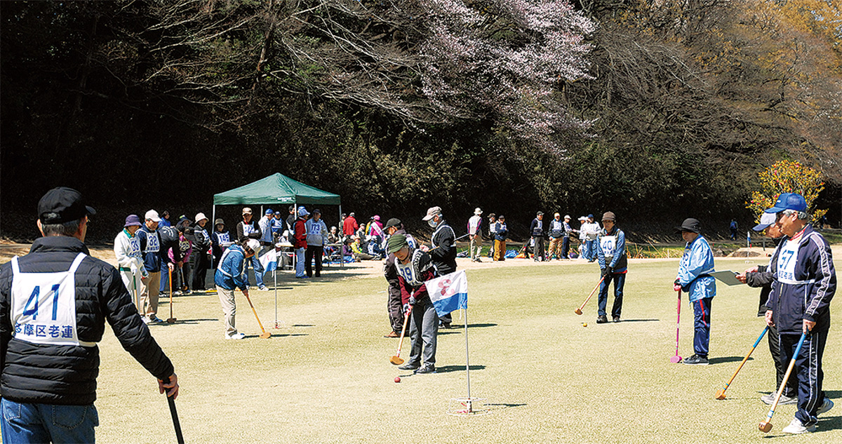 多摩区老人クラブ連合会(山崎雅彦会長)のグラウンドゴルフ大会が4月2日、川崎国際生田緑地ゴルフ場で開催された=写真上。65歳から88歳までの約250人が参加し、競技や花見を楽しんだ。