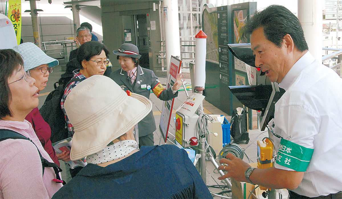 「多摩区は踏切事故が多い。実際に装置を見てもらうことで啓発になる」と多摩交通安全協会の原田弘会長。JR登戸駅の縄浩太郎駅長は「まずは非常ボタンの存在を知ってもらう必要がある。危険な状況を見つけたら踏切に入らず、まずはボタンを押してもらいたい」と語った。