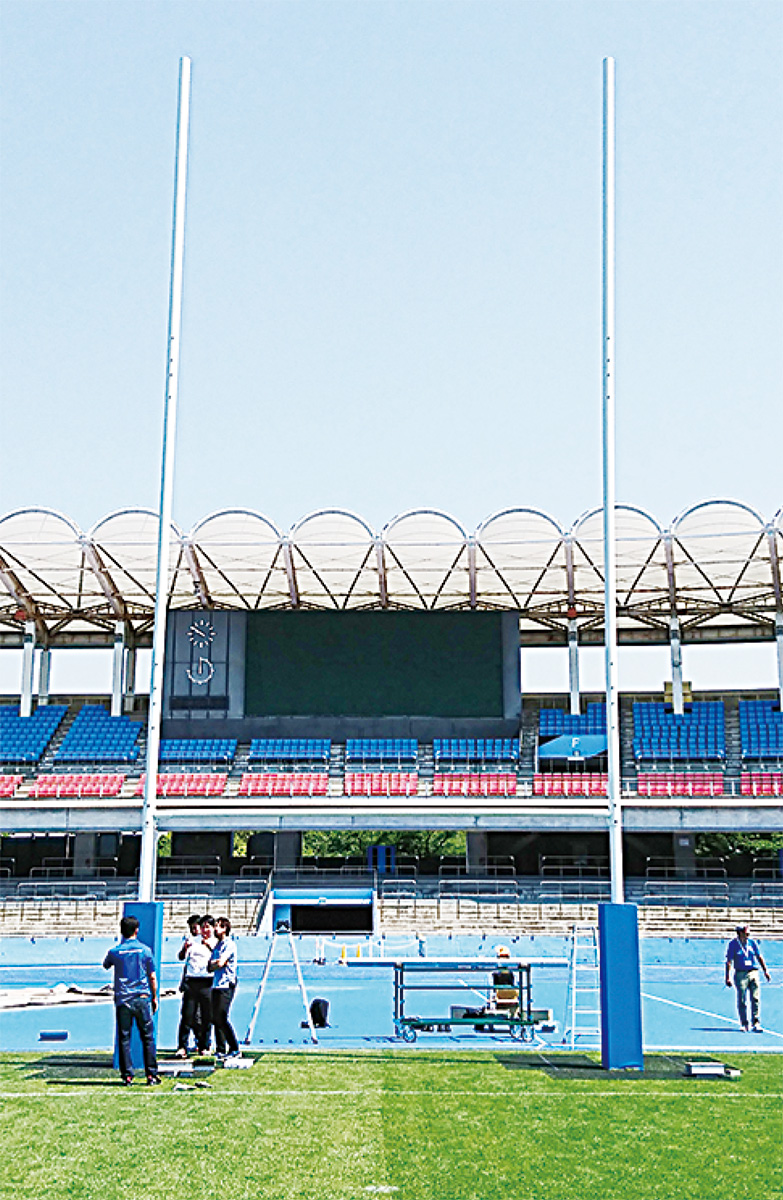 5月22日、ラグビーで使用する13メートルのH型のゴールポストを、同競技場の現場スタッフが同協会などの関係者と共に試験的に設置した。