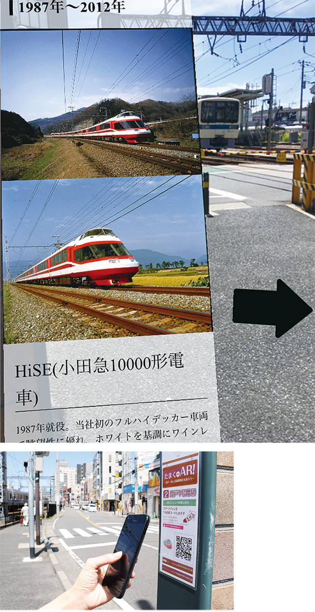 各スポットには異なるARの仕掛けが隠されている。岡本太郎美術館では、太郎と一緒に写真の「自撮り」ができるARフォトフレームが起動。登戸1号踏切には、1957年から現在までのロマンスカーの貴重な写真と解説が見られるARがあり、小田急電鉄の協力で実現したという。