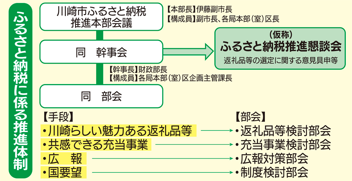 伊藤弘副市長を本部長として発足した「推進本部会議」では、各区長らが名を連ね「川崎らしい魅力ある返礼品」の開発などに着手。サッカーJ1・川崎フロンターレやミューザ川崎など、地域密着のプロスポーツクラブ、商業施設にちなんだ返礼品を検討している。寄付方法の充実化や情報周知のためのポータルサイト運用も今秋を目途に開始。市財政局は「ふるさと納税制度の活用で地域の魅力ある資源を発掘し、市のイメージを向上させて市内外に発信したい」と話している。