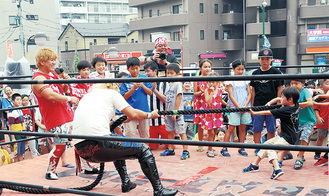 本部前の大踏切ステージでは、子どものダンスグループが演技を披露。来場者の注目を集めていた。ダイエー前では地元プロレス団体ヒートアップ(田村和宏代表)の試合に加え、選手と子どもたちによる綱引き対決が行われた=写真上。