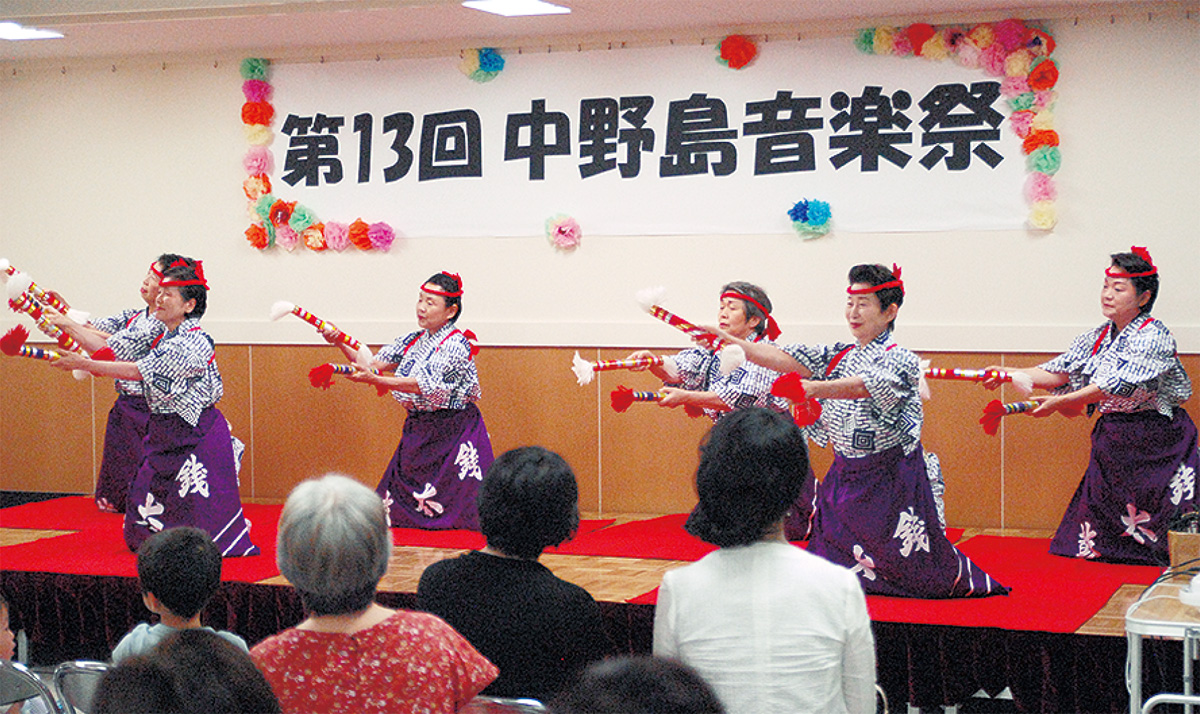 観客が広場を囲む中、和太鼓クラブ「風」や中野島ロックソーラン隊、中野島一輪車クラブなど5組が出演。館内でも民謡やコーラス、漫才など多様な演目が披露された。中野島商店会の納涼バザールも同時開催。ヨーヨー釣りやスイカ割りなど、多くの子どもたちでにぎわった。
