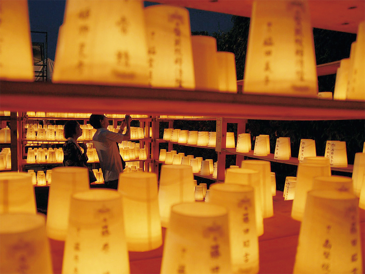 • 境内を埋めるように並び、温かな光がゆらめく献灯