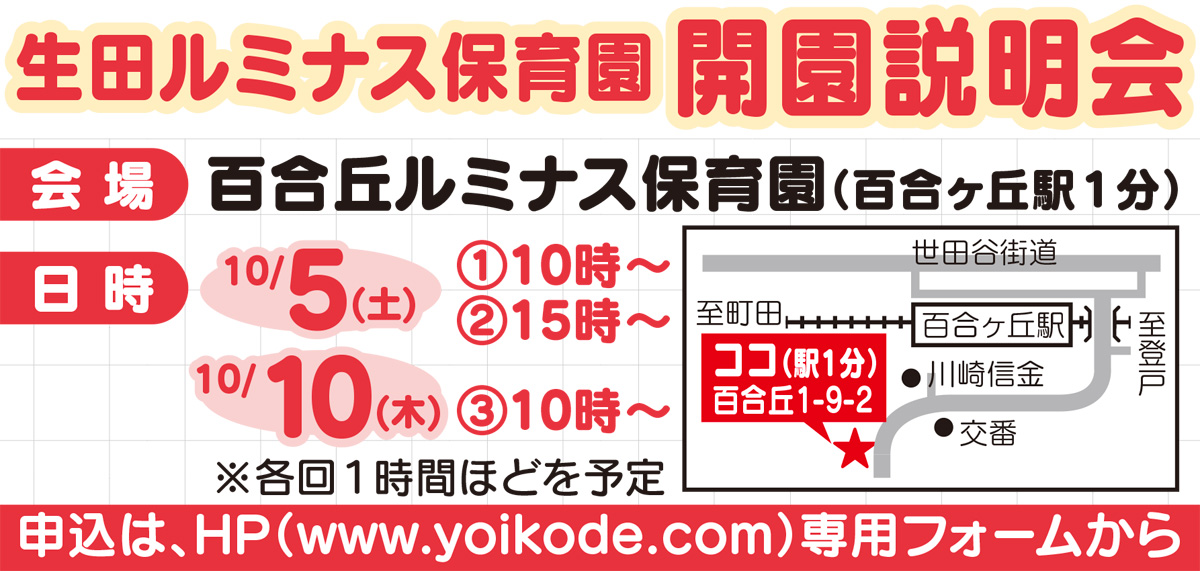 来春の保育施設利用を検討している保護者に向けた今回の説明会。日時は10月5日(土)が午前10時と午後3時、10日(木)が午前10時。会場は姉妹園の百合丘ルミナス保育園(百合ヶ丘駅1分)。