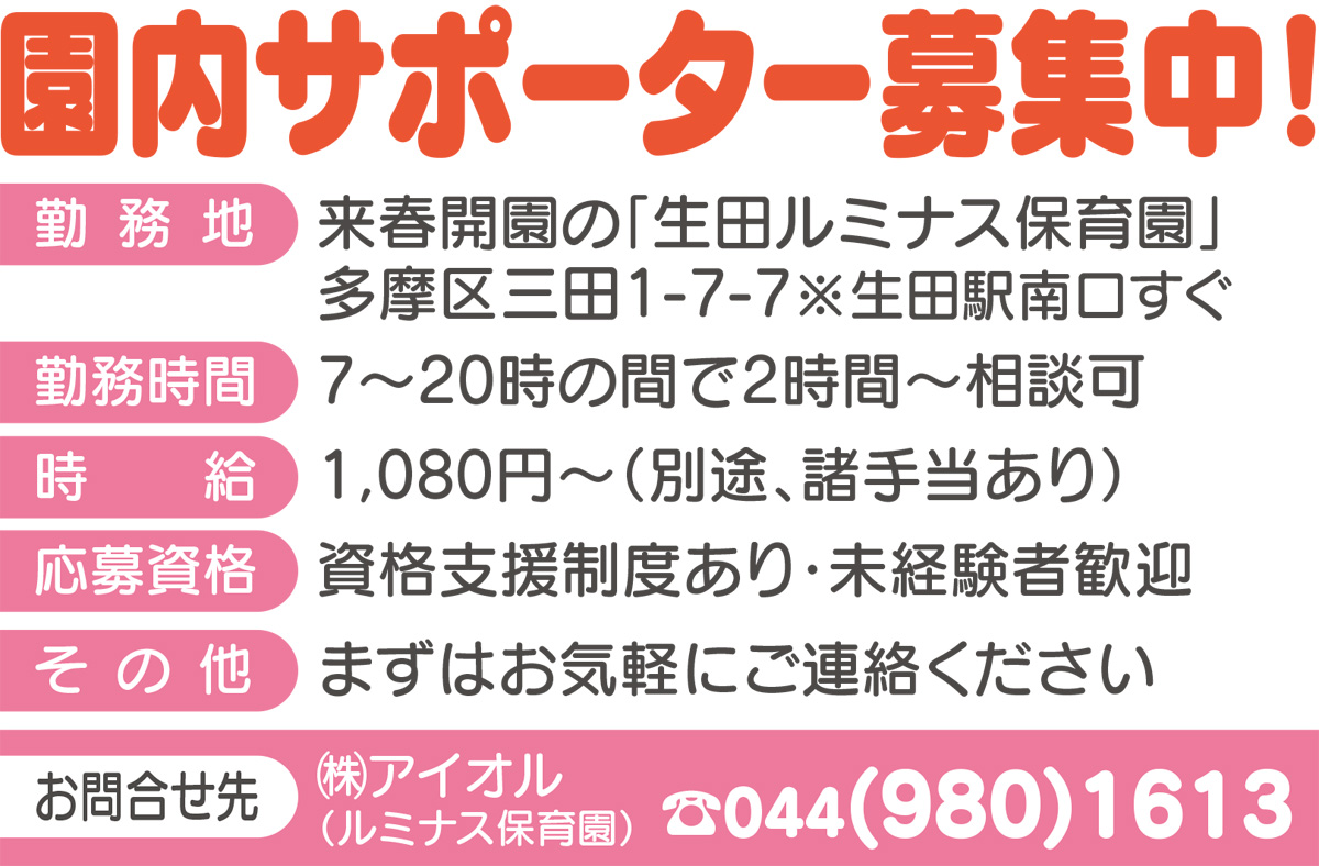 ■生田ルミナス保育園準備室【電話】044・980・1641、【メール】sanka-ikuta@yoikode.com 【URL】www.yoikode.com/ ※求人情報あり(詳細は別枠を参照)