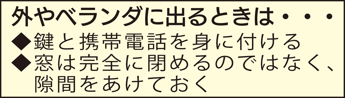 閉め出し防止や閉め出された際の対策として、同署は4つの方法を示す。【1】玄関から出るときは時間が短くても鍵を身に付けておく【2】ベランダに出るときは窓に隙間をあけておく【3】緊急性がなく鍵を開けたい場合は業者に依頼する【4】家や部屋の外に出るときは携帯電話を携行する――。秋元署長は「ベランダの窓は、できれば隙間に何かを挟んでおくことがベスト。事前にどのくらい開けておけば鍵がかからないか確認しておきましょう」と警鐘を鳴らす。