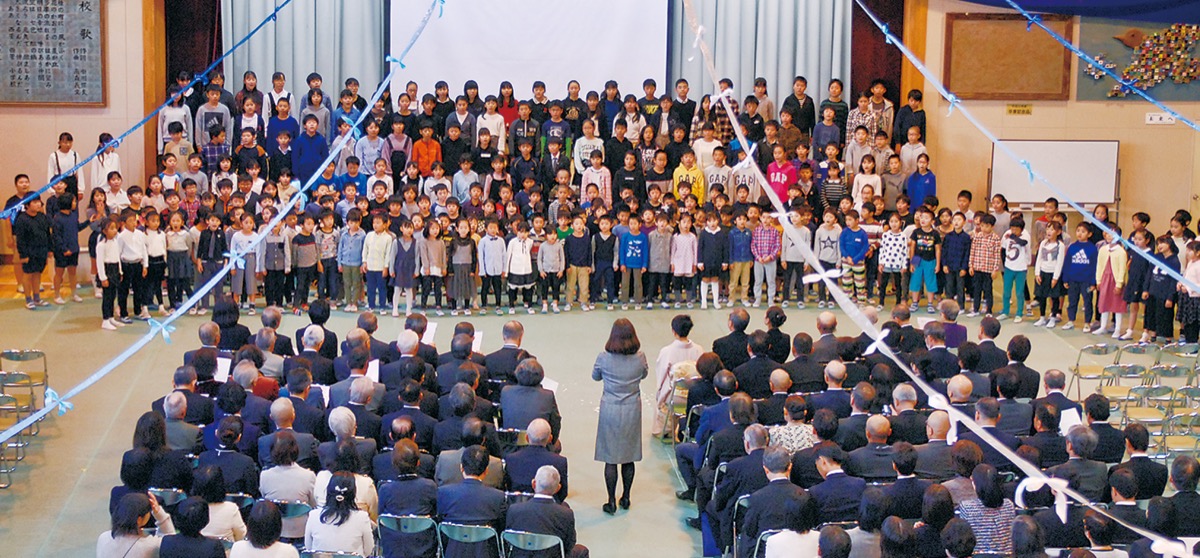 式典には、30年前に校歌を作詞した小川信夫さん、作曲した高森義文さんも参列。小川さんは「喜んで作った校歌。30年間ずっと歌い続けてくれて心から感謝している」、高森さんは「大事なのは音楽を好きになること。皆さんはきっと好きになってくれる人だと思う」とそれぞれ思いを語った。2人を紹介した後は、音楽講師らの演奏で校歌を斉唱。岩倉校長は「今日は100人を超える方たちが集まってくれた。地域の皆さんに支えられ、助けられ、つくっていただいた学校」と感謝を込めた。