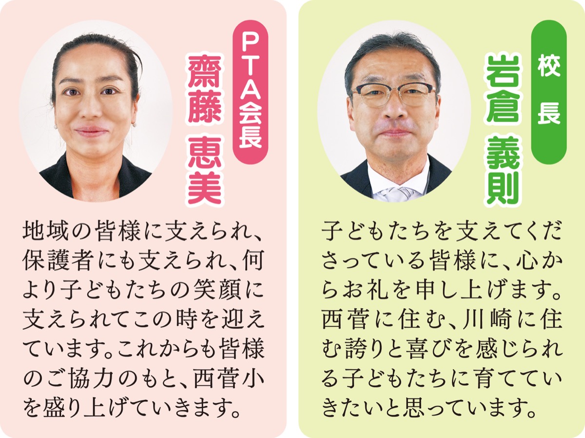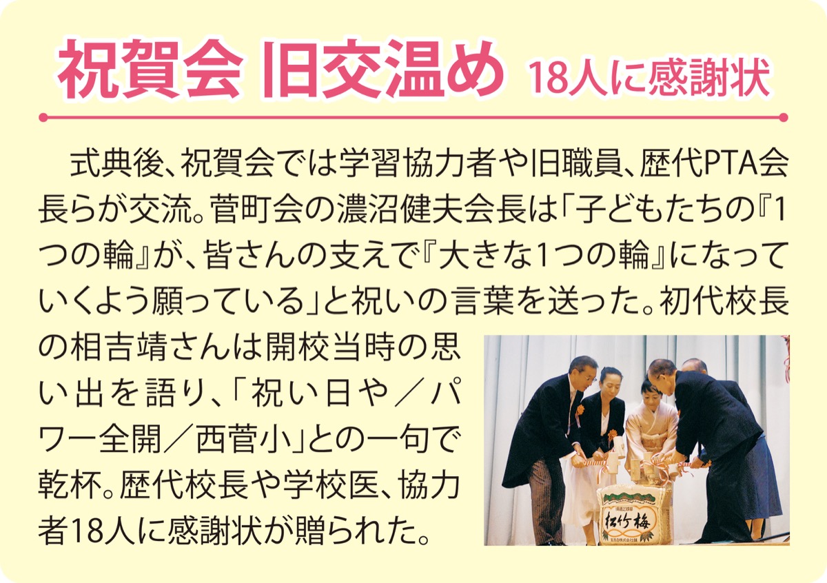 多摩区内で一番新しい西菅小は、1990(平成2)年に開校。南菅小から223人、他校から209人の児童が集まってスタートした。式典翌日の17日には「大同窓会」も開催され、およそ50人の卒業生が思い出話に花を咲かせた。