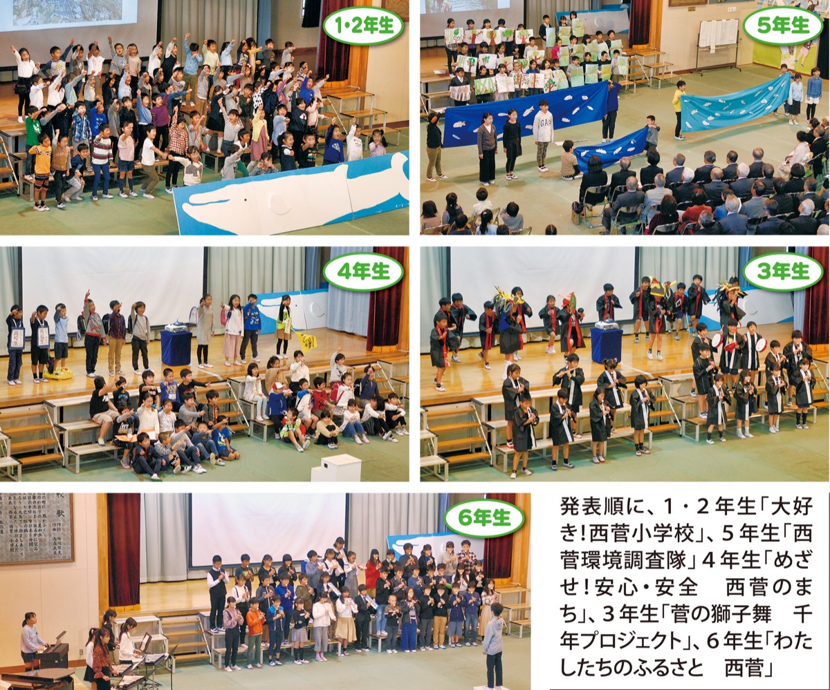 各学年の発表は「西菅大好き〜学びの先にあるもの」と銘打ち、1年生の国語で習う「くじらぐも」を軸に1つの物語として表現。1、2年生は一緒に学校の好きなところを紹介し、5年生は里山や三沢川などの地域資源を「調査隊」として報告した。4年生は児童の安全を守る地域のボランティアになりきって感謝を伝え、3年生は菅獅子舞保存会から教わった舞と笛を披露。6年生は合奏で地域への思いを表現した。エンディングも、全校児童の合唱「ぜんぶ」で締めくくった。