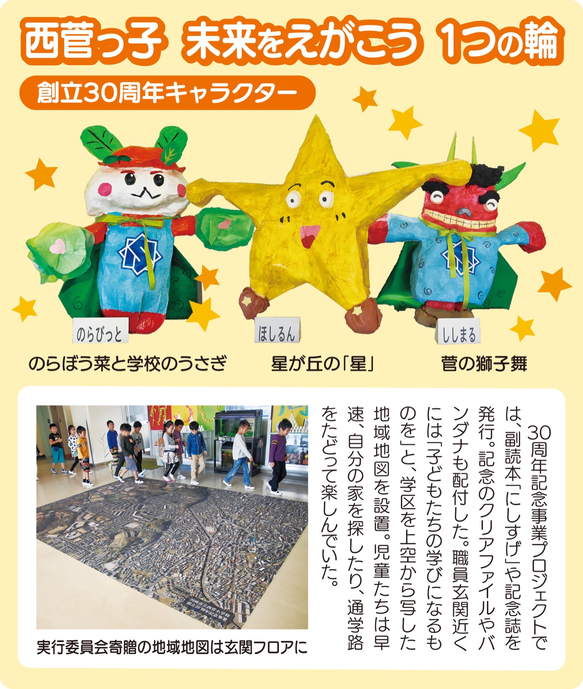 式典は全校児童の合唱「今日から明日へ」でスタート。昨年度の卒業生が考えたスローガンやキャラクターが紹介された。創立30周年記念事業実行委員会の深城由美子実行委員長=人物風土記で紹介=は「すてきな1日が未来の西菅につながるように、全員で心を一つにして温かい時間に」と呼びかけた。