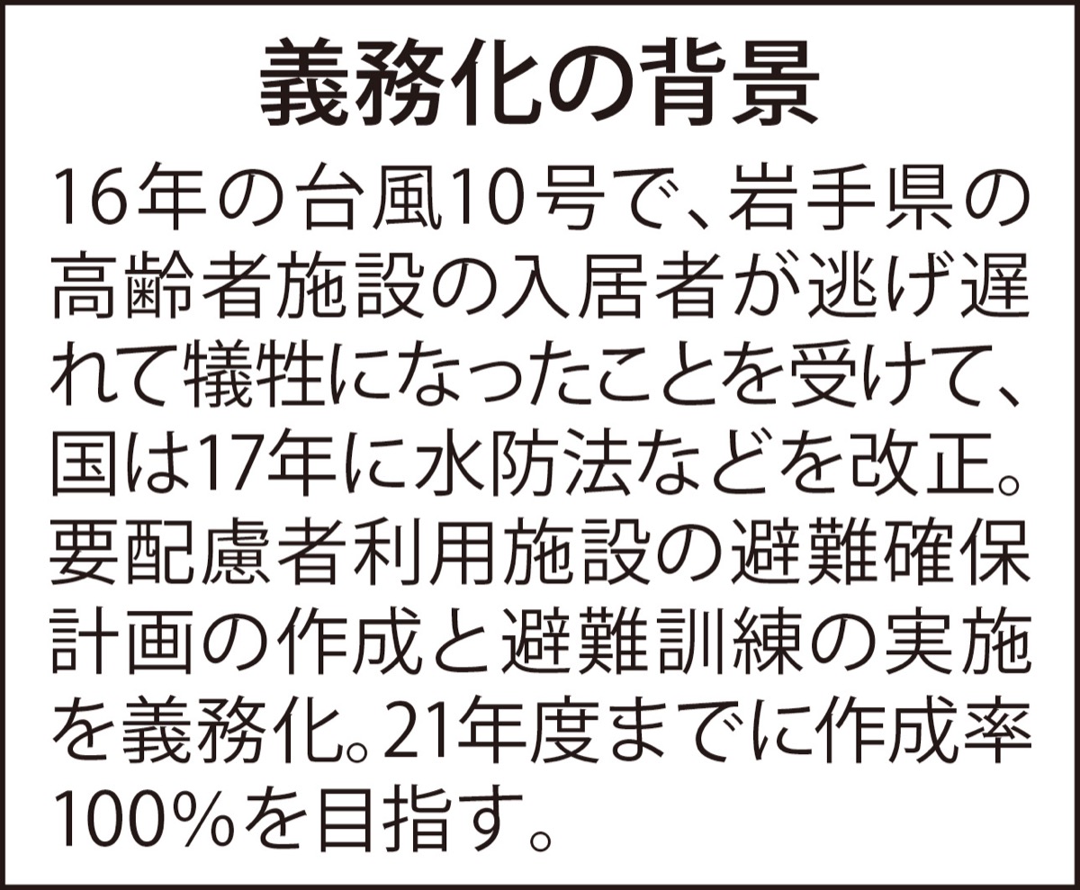 避難確保計画は、避難場所や避難時機、職員対応など、利用者の迅速な避難に必要な事項を記す。浸水想定区域や土砂災害警戒区域にある社会福祉施設、学校など、避難に支援が必要な「要配慮者」の利用施設で作成が義務付けられている。