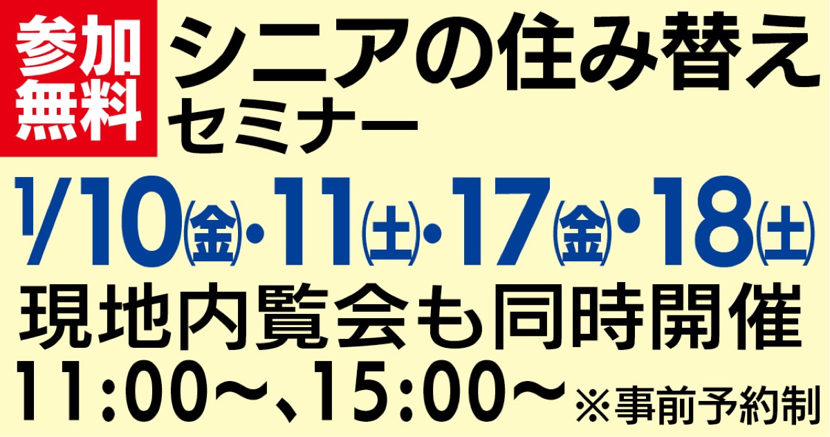 自身の将来や親の事を考えた際の重要なテーマは”安心して暮らせる住まい”だろう。「高額な費用がかかるのでは?」「高齢者住宅ってどんな種類があるの?」などの不安や疑問を解消してくれる『シニアの住み替えセミナー』(参加無料)が1月10日(金)・11日(土)・17日(金)・18日(土)に開催される。いずれも事前予約制。セミナーでは、高齢者施設の種類や特徴のほか、費用面の違い、物件を選ぶ際のポイントなどを個別にシニアホームアドバイザーに相談することができる。