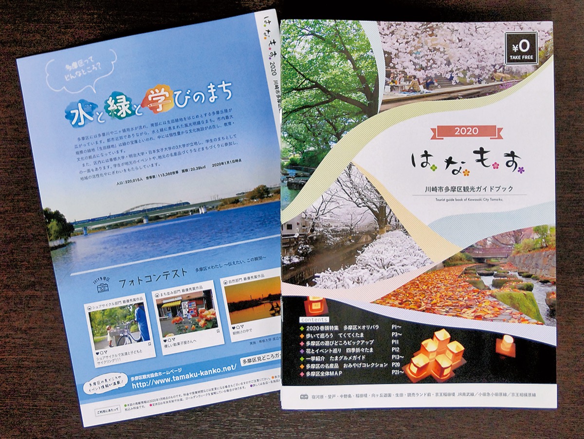 多摩区観光ガイドブック「はなもす」の2020年度版=写真=がこのほど発行され、配布を開始した。多摩区観光協会(末吉一夫会長)発行、タウンニュース社製作。