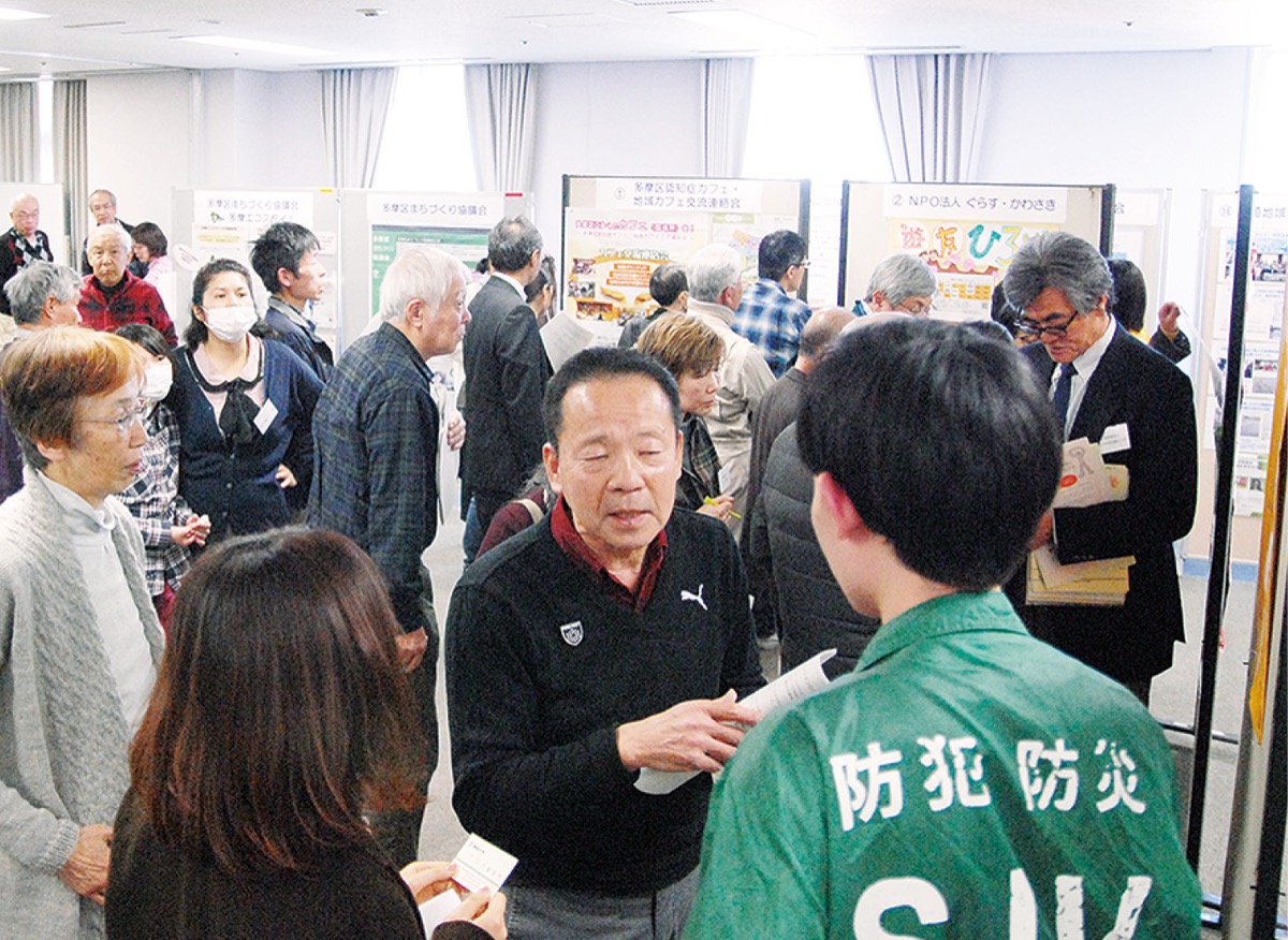 今回の「まちカツ!」には23の市民団体が参加。16年から同協議会を率いる葛生茂会長は「市民活動の輪を広げるきっかけづくりができたと思う。皆さんの支援に感謝」と思いを述べた。各団体が活動を発表するポスターセッション=写真右=では、参加者同士が印象に残った団体に投票。ベストプレゼンたま賞に、専修大学の2団体が輝いた。選ばれたSIV(専修生田ボランティア)の稲村健輔さんは「若い世代が受け継いで多摩区を活性化していけたら」と話し、葛生会長は「若い人がまちづくりに携わってくれたら本当にありがたい」と期待を込めた。