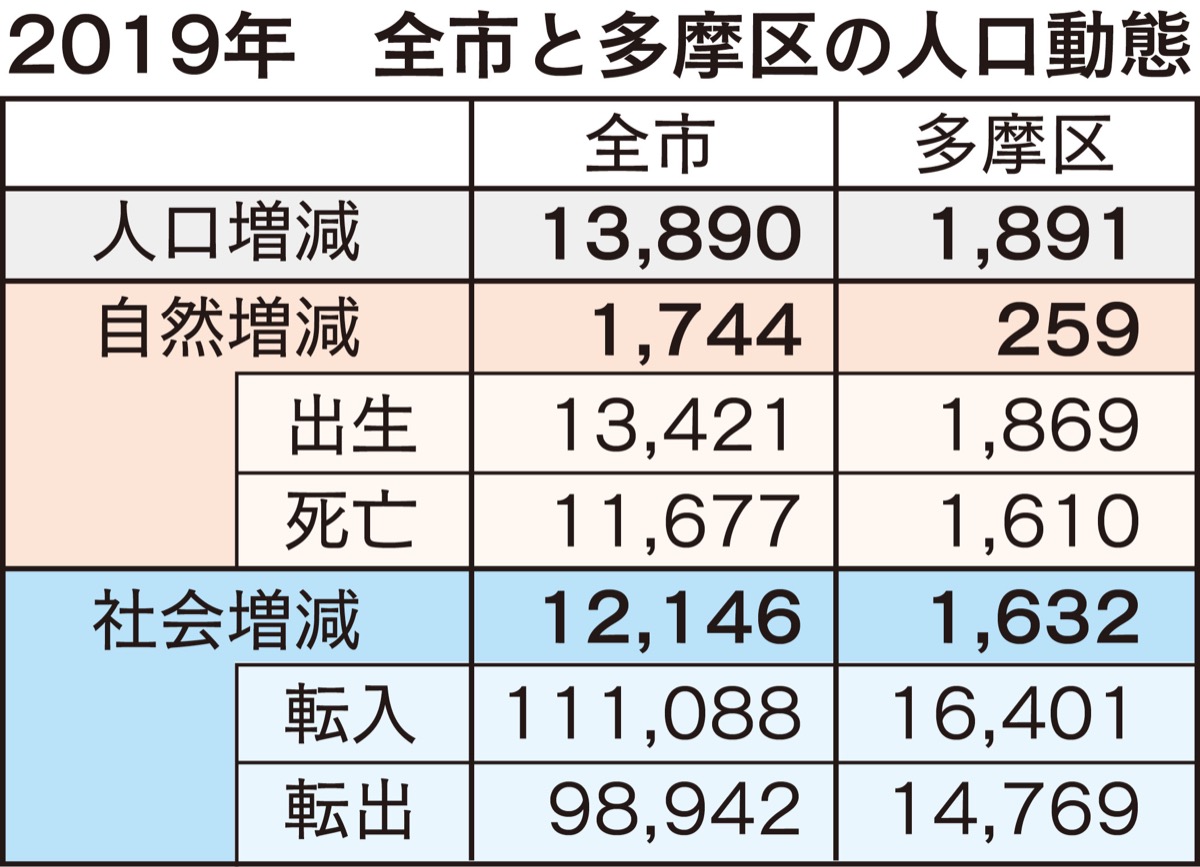多摩区の出生数は過去最少の1869人、死亡数は過去最多の1610人。これにより、自然増減(出生数―死亡数)は259人増で、前年より164人差が縮まった。市全体でみても、自然増数は初めて2千人を下回った。