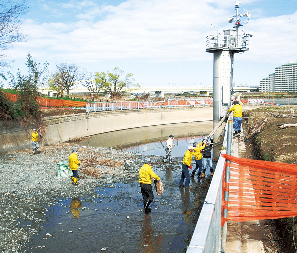 多摩川の水位を下げるため、昨年11月から倒伏されていた二ヶ領宿河原堰。3月25日に堰を平常に戻すにあたり、この間水が流れていなかった二ヶ領用水の宿河原取水口をきれいにしようと、NPO法人多摩川エコミュージアムの会員13人が集まり、17日に清掃活動を行った。