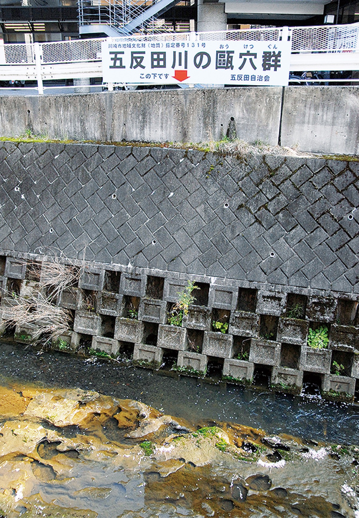 昨年度、川崎市の地域文化財に認定された「五反田川の甌穴群」。より多くの市民に甌穴群の存在を知ってもらおうと、五反田自治会(吉田輝久会長)は4月3日、位置を示す看板を設置した。