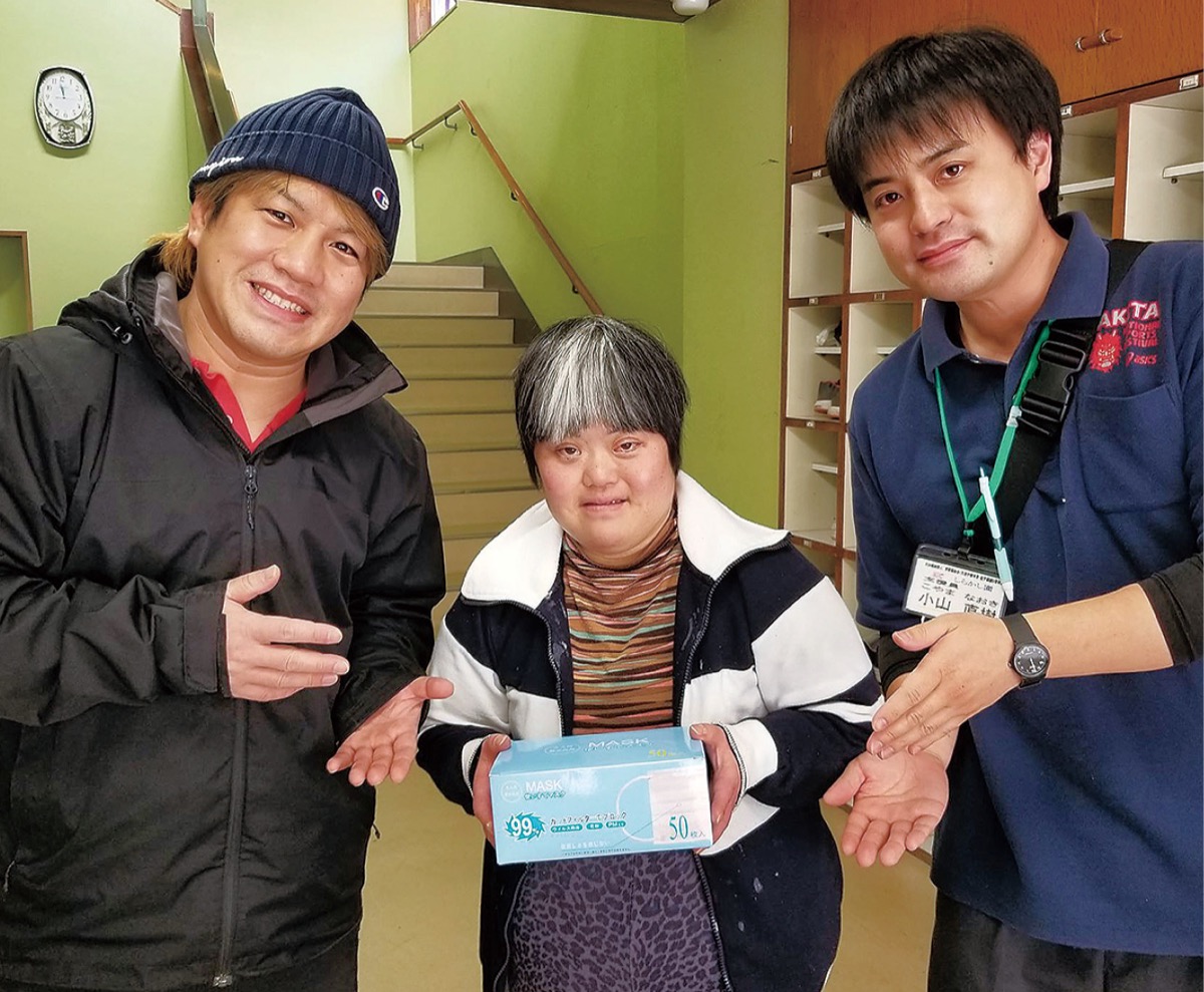 菅北浦で道場を営むプロレス団体「ヒートアップ」は先月、障害者支援として2施設にマスク100枚ずつを寄贈。同団体が動画配信活動を通じて販売した「支援チケット」の売上の一部を活用し、麻生区の「しらかし園」「白山愛児園」に田村和宏代表が届けた。