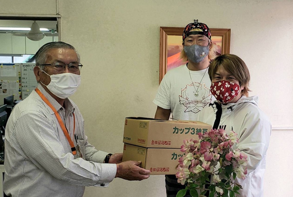 新型コロナウイルスの影響で同店は弁当販売を考えたが、高齢のため「配達が難しい」と知人の同団体代表・TAMURA(田村和宏)選手に相談。兼平大介選手と2人で配達することを決め、弁当を3軒に届けた。配達先の一つ「かじのや納豆」からは、お礼として納豆を受け取った。配達ボランティアは初めてというTAMURA選手は「興行ができない今、地域のために何か行動できればと思った。配達先では『プロレスラーが来た』と喜んでもらうなど、交流の場になってうれしい」と話していた。