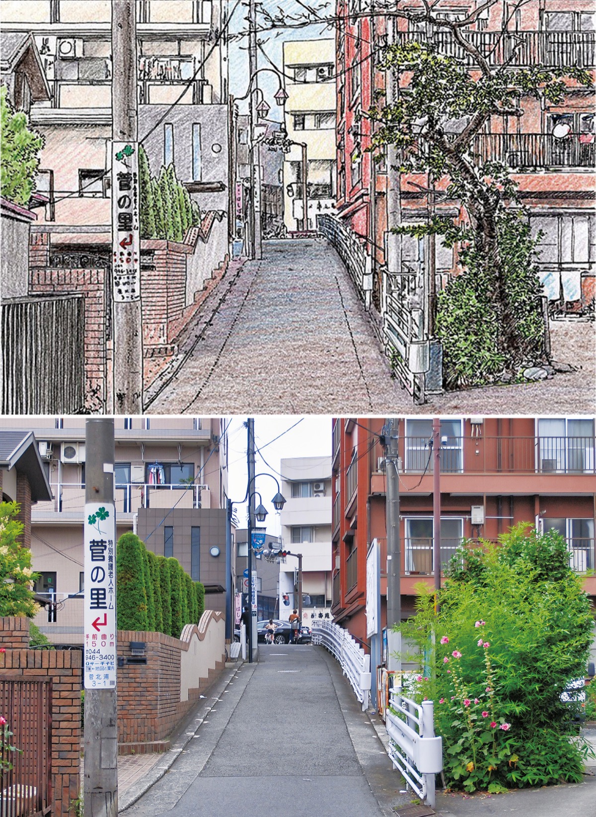 先月までに40カ所を公開し、今後66回までを予定。きょう7月3日は、菅の六地蔵の一つ「出店の地蔵」のスケッチが投稿される。【URL】https://sugechoukai.com/