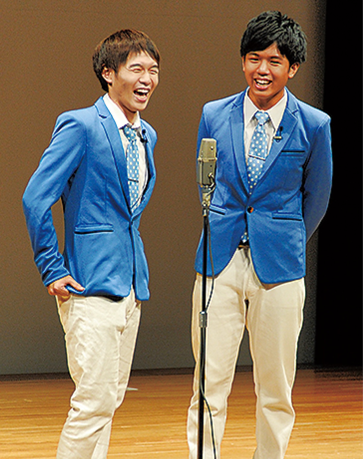 水岡ともや(友弥)さん(20)と武本よしふみ(美文)さん(19)のコンビで、ボケとツッコミのない「ハモリ漫才」を武器に、地元多摩区でも精力的に活動する。今回は漫才やコント、ピン芸を予定。さらに、2人による動画配信企画が縁で交流する、多摩区のプロレス団体「ヒートアップ」所属の井土徹也選手(20)がゲスト出演する。