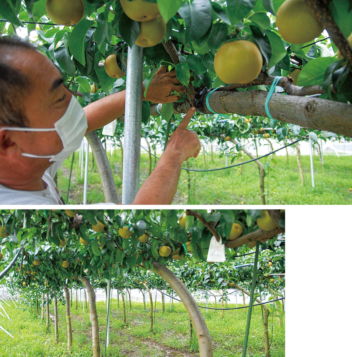 この栽培法では早期に生産量が回復でき、枝が均一に伸びるため剪定や収穫の効率化が図れるという。上原さんの梨園では2メートル間隔で約200本の木を育成。「枝が魚の背骨のように伸び、非常に単純な構造。作業も簡単で次の世代に継ぎやすい」。同園では甘みと酸味のバランスがとれた「豊水」が、9月上旬にかけて収穫のピークを迎える見込みだ。