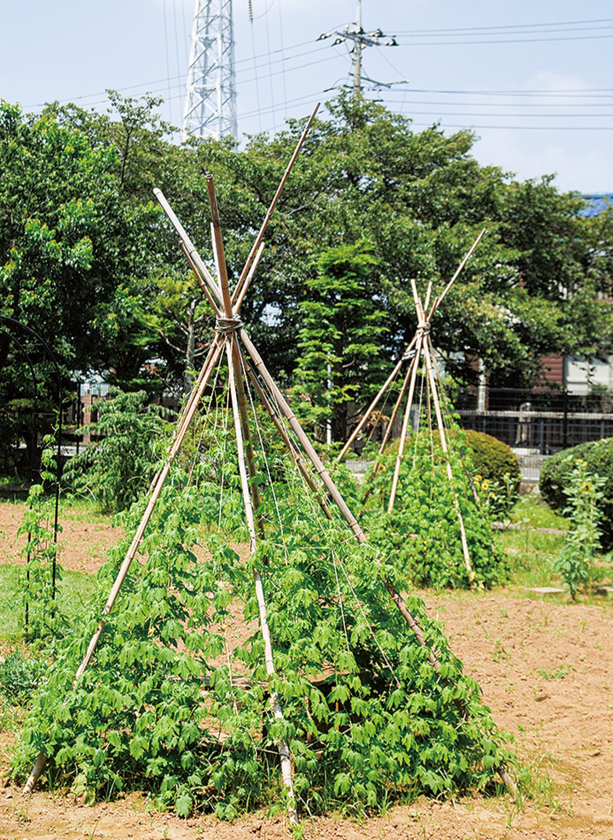 川崎市緑化センター(宿河原)西園の苗畑に先月設置された「ゴーヤのティピー」。ゴーヤが日々つるを伸ばし、日陰をつくり出している。