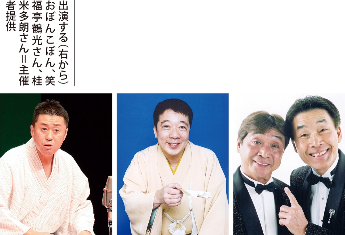 出演者は漫才コンビ「おぼんこぼん」、笑福亭鶴光さん、桂米多朗さんら計5組。午後1時開演、30分前開場。入場料は前売りのA指定席2500円、B指定席2000円(当日は各500円増)。S指定席は完売。店舗のチケット販売は実施していない。問合せは桂米多朗ファンクラブ【電話】【FAX】044・944・3346、メール(yoneta6@ybb.ne.jp)。