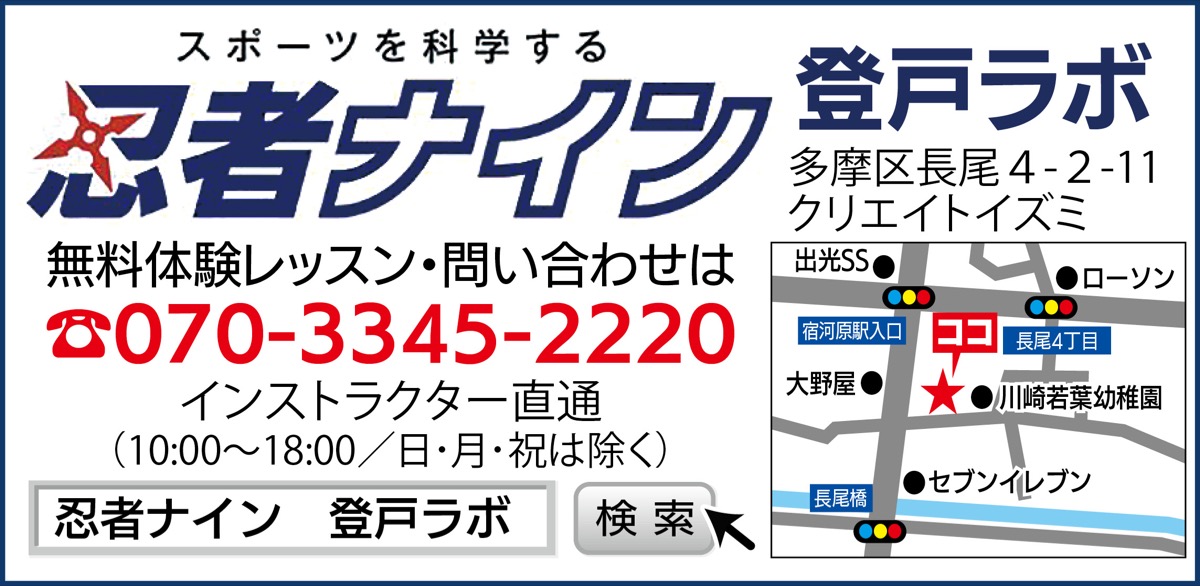 科学的視点で子どもたちの運動能力を伸ばす新発想のスポーツ教室「忍者ナイン」が今月、長尾に「登戸ラボ」を開校。運動神経の礎をつくり、一人ひとりの生まれ持った能力を育てていく。