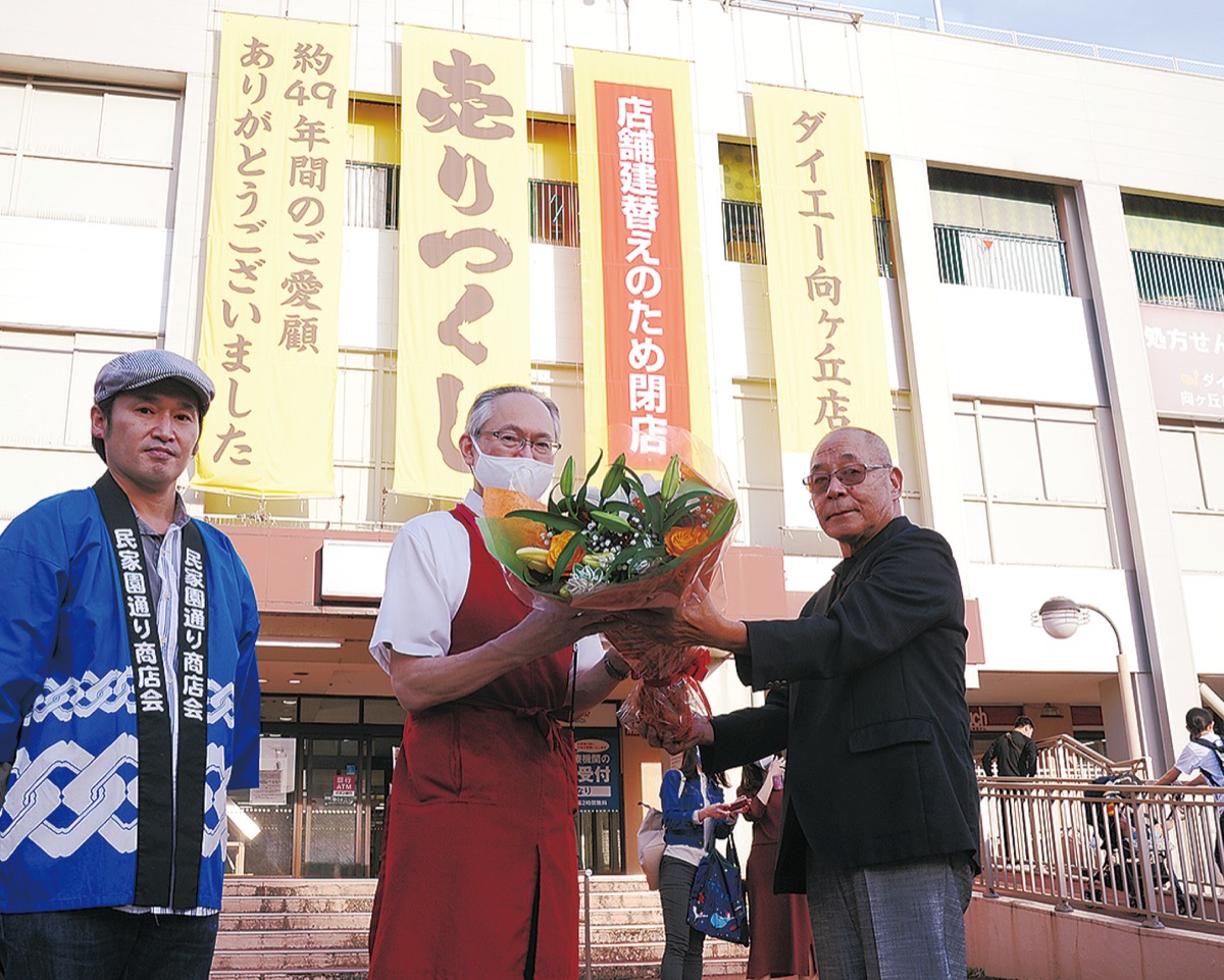 30日には同商店会の岩野正行顧問と井野大輔会長が、同店を訪問。小鳥秀木店長に感謝を伝え、花束を贈った。岩野顧問は「ダイエーさんとは長年の付き合い。昔は交流旅行が毎年恒例だった」と回顧。開店と同年に生まれたという井野会長は「子どものころ連れていってもらうのが楽しみだった。小2のとき柏原芳恵さんがコンサートをここで開催して、大勢でにぎわったのを覚えている」と懐かしんだ。