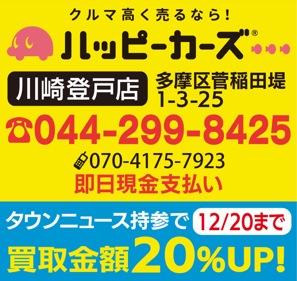 全国70店舗、出張査定で安心の車買取専門店・ハッピーカーズ。川崎登戸店では、本紙持参で買取額20%アップのキャンペーンを実施中。「出張買取で外出不要。感染症対策も万全ですのでご安心を」。古い車も2万円(1500CC未満5千円)以上で買取保証。