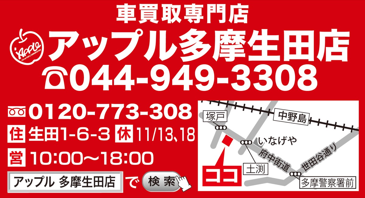 「秋は買い替えシーズン。販売車両が足りていないため買取を強化しています」と話すのは、府中街道沿いにあるアップル多摩生田店の河井三男店長。中古車業界は現在需要が伸びており、全車種で「売り時」。人気のスポーツカーや車検の長い車も高価買取のチャンスだという。河井店長は「コロナ再燃で海外の輸出が止まってきているので、相場が下落する前に相談を」と呼びかける。