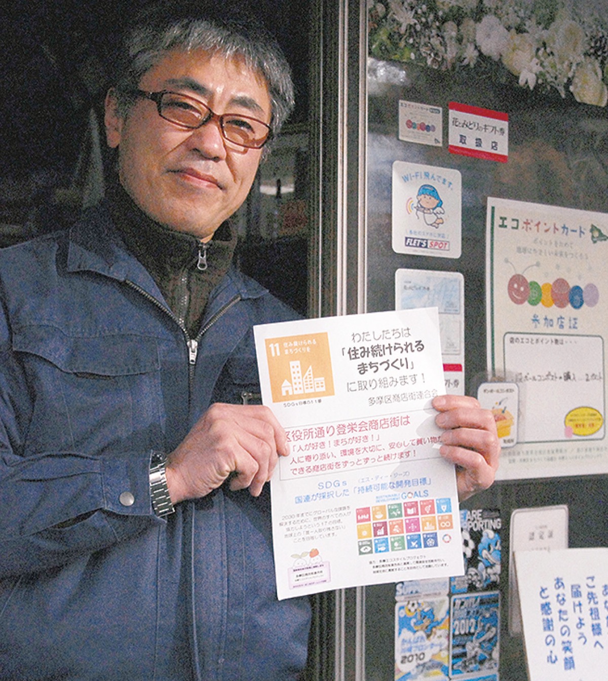 貧困や環境汚染への対策など、2030年までに世界全体で達成すべき17の目標を示した「SDGs」。区商連では市民団体・多摩エコスタイルプロジェクト(本多正典代表)と連携し、SDGsの11番目の目標である「住み続けられるまちづくりを」に着目。商店会として地域で果たせる役割を考える中で、まずは各店舗や来店者に関心を持ってもらおうとポスター掲示を企画した。