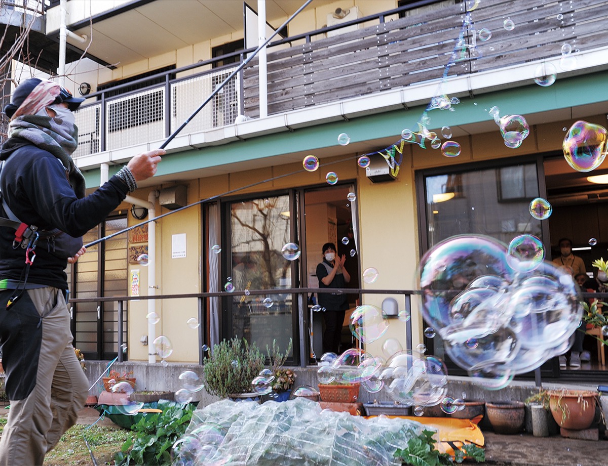 生田緑地や二子玉川公園など野外でシャボン玉を飛ばす「シャボン玉オヤジ」が1月18日、布田の高齢者住宅「上布田つどいの家」を訪問。コロナに立ち向かう医療・介護従事者、利用者に癒しや元気を届けようと、同施設の庭でパフォーマンスを披露した=写真。