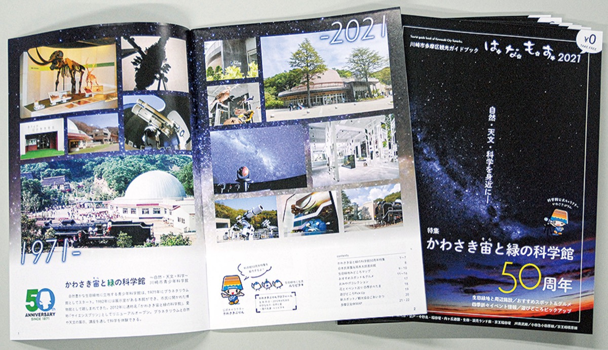 多摩区観光ガイドブック「はなもす」の2021年度版=写真=がこのほど発行された。今回は巻頭で、「かわさき宙(そら)と緑の科学館」の開館50周年を特集している。多摩区観光協会(末吉一夫会長)発行、タウンニュース社製作。