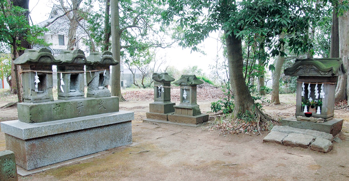 長尾神社の社殿横に粛然と並ぶ6基の「ほこら」。すべて石祠で、側面や背面に建立時の銘が彫られているが、由来は不明な点も多い。